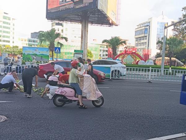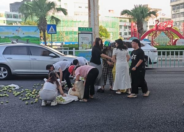 我撿,你裝,他搬運……在大家的齊心協(xié)力下,僅用了短短兩分鐘,路面上的百香果便被清理干凈,交通也隨之恢復(fù)。