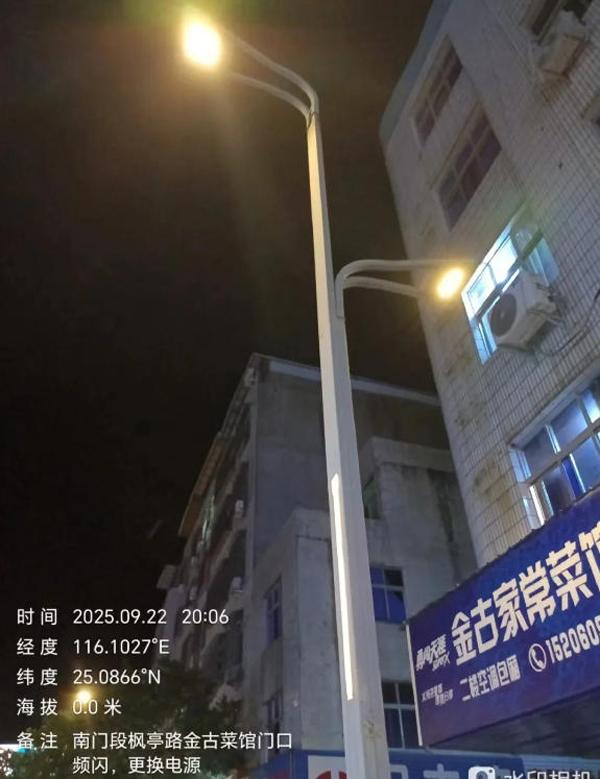 “楓亭路(金古餐館門口)有盞路燈間歇性閃爍?!?/b>9月22日晚上7點14分,市民鐘先生通過微信視頻向武平縣城市管理和綜合執(zhí)法局反映了一處路燈故障。