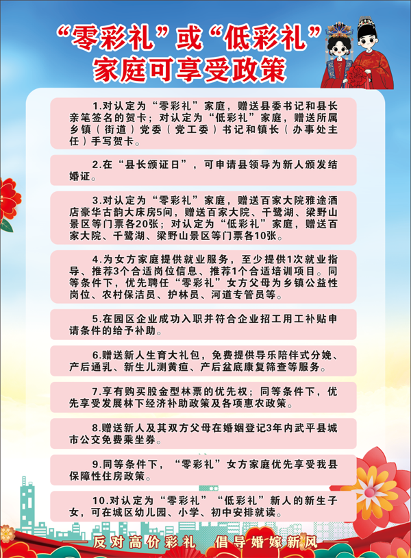 武平縣對被認定為“零彩禮”或“低彩禮”的家庭實行正向十項引導(dǎo)措施,覆蓋精神表彰、生活服務(wù)、就業(yè)住房、教育醫(yī)療等多個維度,既傳遞政策溫度,又給出實際福利。