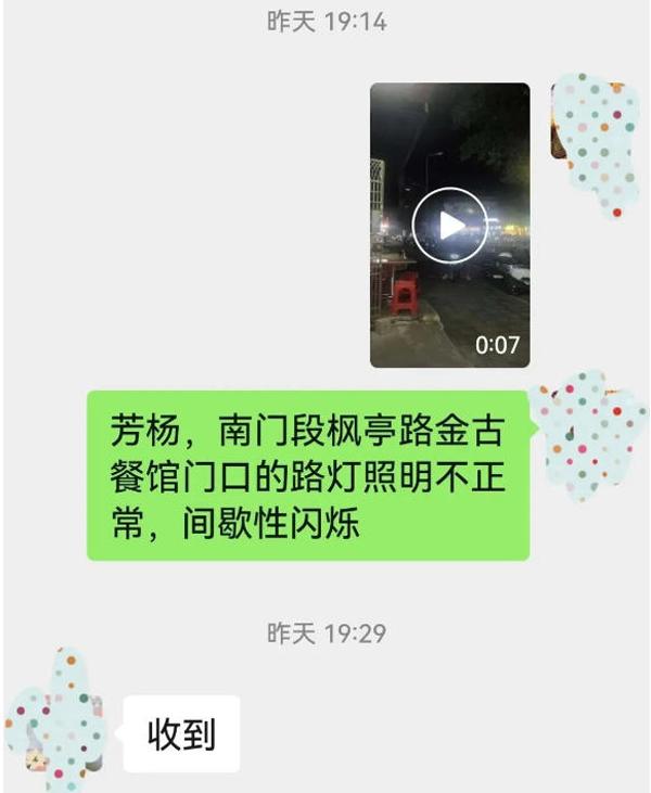 消息發(fā)出僅15分鐘,當晚7點29分,該局市政維護路燈值班負責人在微信上回復:“收到?。R上安排)”